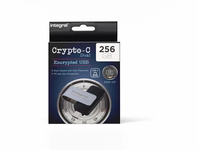 Integral 256GB Crypto-C Dual Encrypted USB Flash Memory Drive, AES-XTS 256-Bit Hardware Encrypted USB 3.2 with Secure Dual Password - Certified to FIPS 197, Compatible with Mac, MacBook, PC, laptop