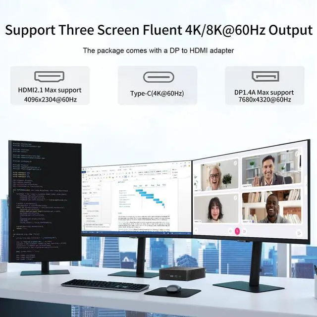 [UHD Triple-Display] Featuring the built-in Intel Iris Xe Graphics (Graphics frequency 1.45 GHz) with Xe architecture. Mini PC supports easy connection to three-monitors via HDMI2.1+USB-C+DP