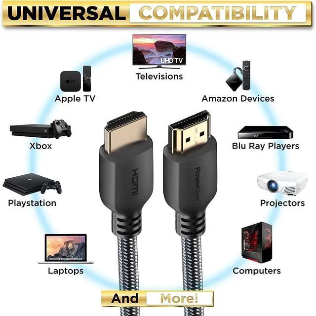 HDMI Cable: Works with all of your HDMI devices. Compatible with Blu-ray players, Fire TV, Apple TV, PS5, PS4, XBox One, Nintendo Switch, computer, laptop, monitor, projector and more. An essential HDMI cable for all of your home & office devices ^^ 50 Feet 1