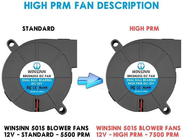 High SpeedWINSINN High PRM 50mm 5015 Blower Fan 12V, operating at 7500RPM, utilizes Dual Ball bearings for high performance and stability, boasting a long lifespan of 50,000 hours, delivering an unparalleled experience.