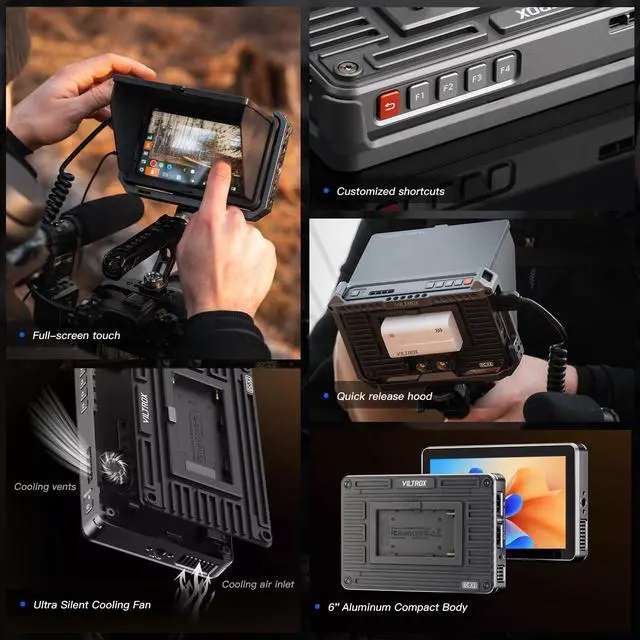 6-inch, 2000-nit high-brightness touchscreenVILTROX DC-X2 field monitor provides a clear imageswith 2000 nit high-brightness display, 4K Full HD 1920 x 1080 resolution (60Hz), a 6-inch IPS panelan ultra-wide 160°viewing angle, 1000:1 contrast ratio, REC-709 color calibrationmaking you easy to get perfect focus and framing.