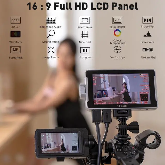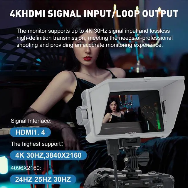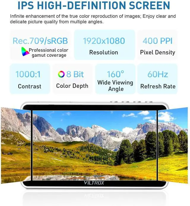High Resolution Display: VILTROX DC-V1 camera field monitor provides a sharp image, with 400nits high-brightness display screen, 4K full HD 1920 x 1080 resolution at 30Hz, a 5.5inch IPS panel with 160° viewing angles, 1000:1 contrast ratio, REC-709 color calibration, making you enjoy sharper and richer colors image.
