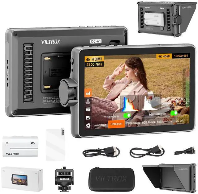 LUT & PRO MONITORING TOOLS: Built-in 3D LUTs and USB import support allow real-time color grading. Includes waveform, vectorscope, false color, zebra, histogram, peaking, audio meters, and moreprofessional tools to ensure precise exposure and framing. ^^ FLEXIBLE POWER & EFFICIENT COOLING SYSTEM: Runs on NP-F batteries (1x NP-F550 included), DC (10-18V), or USB-C (9V/3A) for versatile power in any setting. An ultra-quiet fan with auto mode provides efficient cooling without noise disruption. ^^ PERFECT FOR CREATORS ON THE GO: Weighs only 348g and comes with a tilt/swivel mount, quick-release sunshade, HDMI cable, battery, and carrying bag. Ready for fast-paced productions and long outdoor shoots.