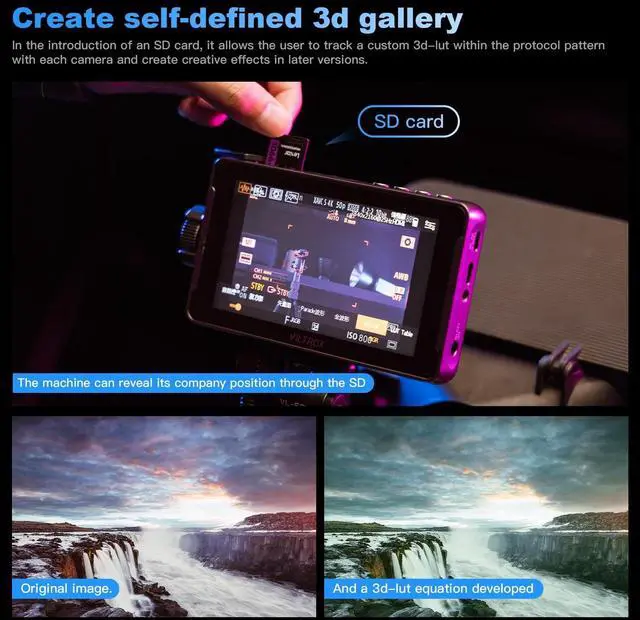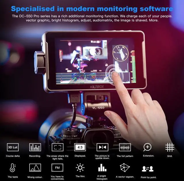 Full HD Monitor Viltrox dc-550 pro 5.5 inch Camera Monitor with a high resolution of 1024x600 pixels, high pixel density and high brightness provides excellent image quality and a great visual experience for the photographer's professional needs. ^^ Touch Screen and Large Knob DesignCamera monitor 4k Easily access your menu settings and features by simply tapping the screen. Additionally, Viltrox field monitor 5 inch is compatible with physical button control. Tap or rotate the wheel button for swift selection and function settings. ^^ Professional monitoring software 3D LUTVILTROX DC 550pro 5.5 Inch Camera Monitor has extensive monitoring functions.