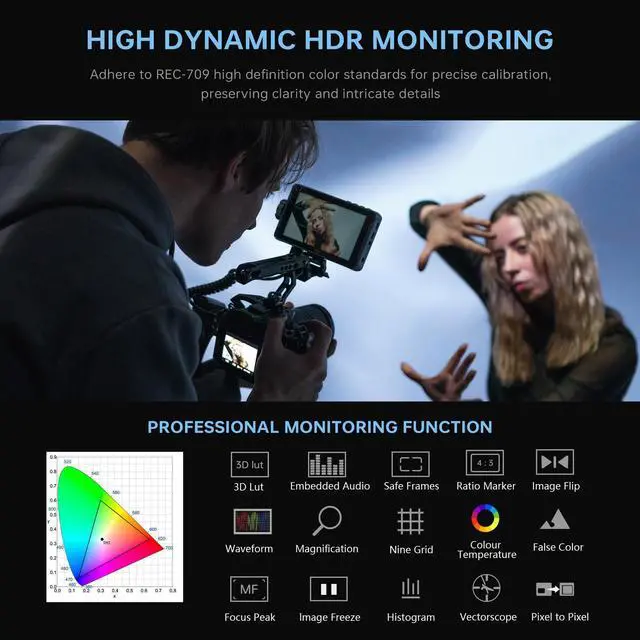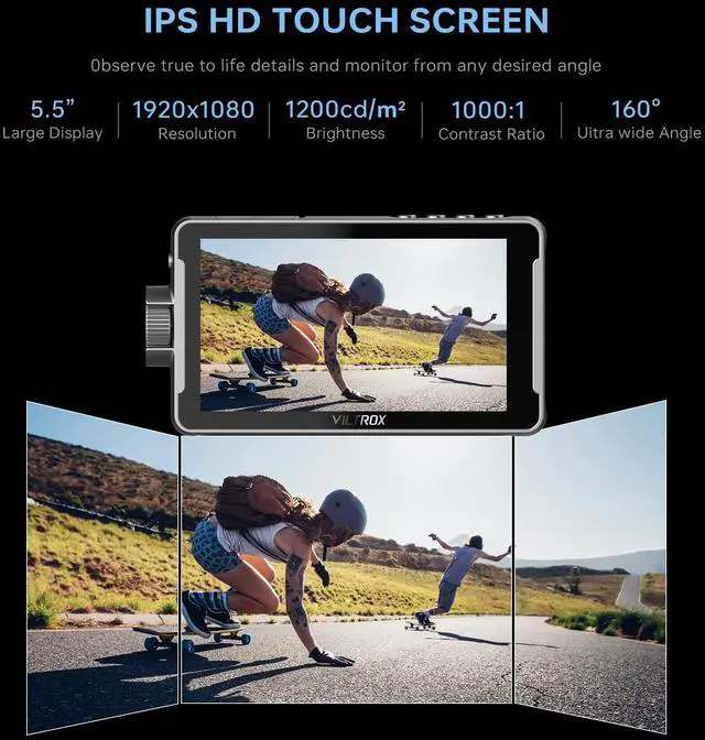 Brightness IPS Touch Screen: The VILTROX DC-550 Pro 5.5" touchscreen camera field monitor has 4K Full HD 1920x1080 resolution and 403PPI pixel density to make every shot look amazing, Outputs a brightness of 1200 nits and displays a 1200:1 contrast ratio and sRGB / Rec. 709 Color Gamut, resulting in exceptional screen clarity even in intense lighting conditions ^^ Professional