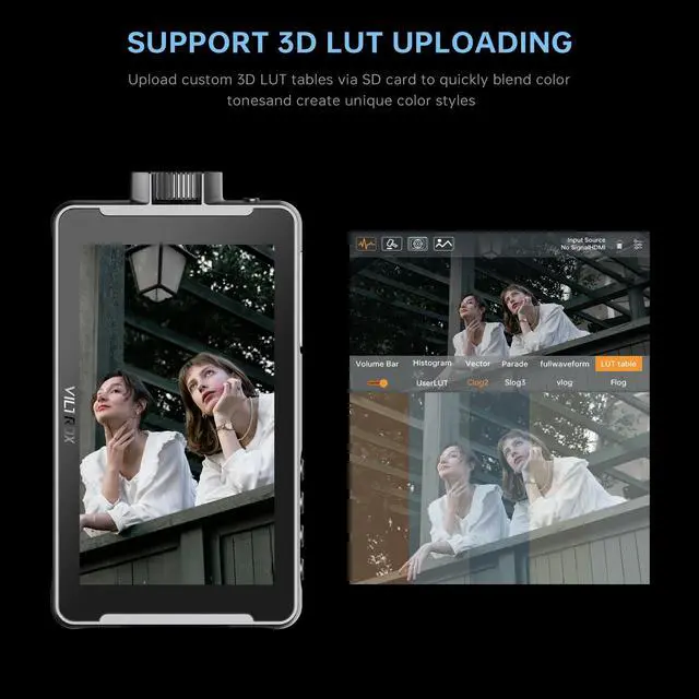 3D LUT: The VILTROX DC-550 Pro camera video monitor has lots of professional monitoring functions, such as Parade waveform, vector graph, brightness histogram, auxiliary focus, audio column, image flip, false color, etc. SD Card Slot Support for Importing 3d Luts and Firmware Upgrades. The photographer can achieve a variety of creative effects in the post-editing and use any camera Log mode to shoot and monitor ^^ 5.5" 1200 Nits High