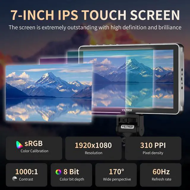 Nits: 4K 1920x1080p Full HD IPS touchscreen camera field monitor rig cage, with HDMI 2.0 output and input, With a 60Hz refresh rate and a 160 viewing angle, the screen can be clearly seen even in strong sunlight, with Rec. 709 and sRGB color spaces, covering 100% of the professional color gamut, adjusting details and avoiding excessive post-processing.