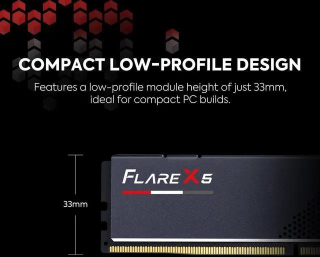 G. SKILL Flare X5 Series DDR5 U-DIMM Memory Kit, Model: F5-5600J3636C16GX2-FX5 ^^ 32GB total capacity kit containing 2x16GB modules, rated for up to DDR5-5600 CL36-36-36-89 at 1.20V ^^ Non-ECC, DDR5 U-DIMM, 288-pin, for Desktop PC & Gaming ^^ Includes JEDEC default profile, and AMD EXPO memory overclock profile ^^ Do not mix memory kits. Memory kits are sold in matched kits that are designed to run together as a set. Mixing memory kits will result in stability issues or system failure. ^^ For AMD X870, AMD X670, AMD B850, AMD B840, AMD B650, AMD A620 platforms. Refer to G. SKILL memory QVL or RAM Configurator tool on the G. SKILL website for more details on validated motherboard and hardware. ^^ Usage in any manner inconsistent with manufacturer specifications, warnings, designs, or recommendations will result in lower speeds, system instability, or damage to the system or its components. ^^ Memory kits will boot at JEDEC default SPD speed at default BIOS settings with compatible hardware. ^^ For memory kits with XMP and/or EXPO overclock profile, enable XMP/EXPO/DOCP/A-XMP profile in BIOS to reach up to the rated potential XMP or EXPO overclock speed of the memory kit, subject to the use of compatible hardware.