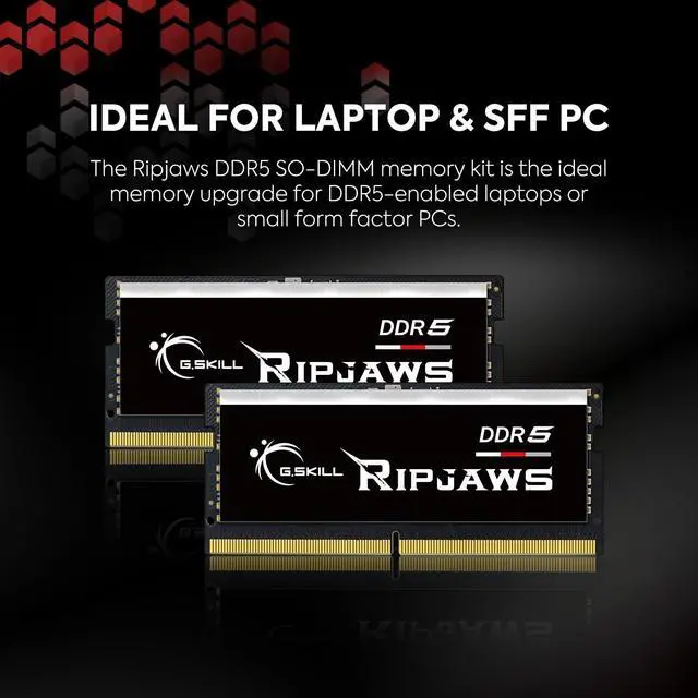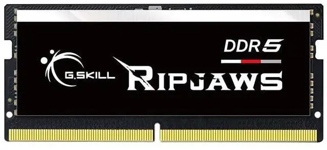 G. SKILL Ripjaws DDR5 SO-DIMM Series DDR5 SO-DIMM Memory Kit, Model: F5-4800S3434A16GA1-RS ^^ 16GB total capacity kit containing 1x16GB module, rated for up to DDR5-4800 CL34-34-34-76 at 1.10V ^^ Non-ECC, DDR5 SO-DIMM, 262-pin, for Laptop/Notebook ^^ Includes JEDEC default profile, and Intel XMP 3.0 memory overclock profile ^^ Do not mix memory kits. Memory kits are sold in matched kits that are designed to run together as a set. Mixing memory kits will result in stability issues or system failure. ^^ Refer to G. SKILL memory QVL or RAM Configurator tool on the G. SKILL website for more details on validated motherboard and hardware. ^^ Usage in any manner inconsistent with manufacturer specifications, warnings, designs, or recommendations will result in lower speeds, system instability, or damage to the system or its components. ^^ Memory kits will boot at JEDEC default SPD speed at default BIOS settings with compatible hardware. ^^ For memory kits with XMP and/or EXPO overclock profile, enable XMP/EXPO/DOCP/A-XMP profile in BIOS to reach up to the rated potential XMP or EXPO overclock speed of the memory kit, subject to the use of compatible hardware. Enabling XMP or EXPO is an act of overclocking and requires BIOS setting adjustments.