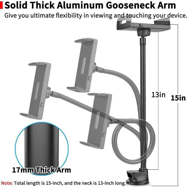 Flexible Long Arm: With its thick, rubberized aluminum pipe construction and superior extra-long 13-inch arm, APPS2Car tablet holder for car makes it simple to access and use your tablet or smartphone close to your finger ^^ Strong