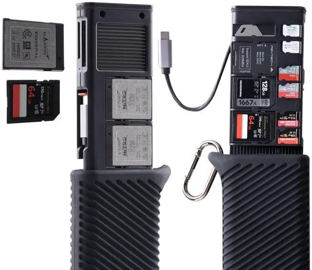 Card Reader& Card Case 2 in 1Specially designed for CFexpress Type B, SD, Micro SD, this product integrates card storage and ultra-high-speed data reading functions. It serves as the reliable companion for photographers who prioritize both efficiency and convenience ^^ Up To 10Gbps Transmission SpeedWith a built-in USB 3.2 Gen 2 chip, it features a transmission speed up to 10Gbps; Compatible with CFexpress memory cards, boasting theoretical data transfer speeds of up to 1000MB/s; Compatible with SD 4.0 SD/Micro SD cards (via high-speed card adapter which included), boasting theoretical data transfer speeds of up to 312MB/s ^^ Dual Card Slots For TransferringCFexpress and SD/Micro SD dual card slots.