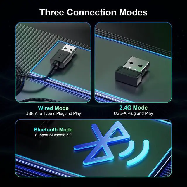 3-in-1 Versatile Connectivity Supports Bluetooth, Type-C wired, and 2.4G wireless modes for seamless switching. Ideal for gaming, work, and mobile use with laptops, tablets, and smartphones. ^^ 7 Programmable Buttons Customize macros and shortcuts for gaming and work efficiency. Perfect for FPS, MOBA, and MMO games, as well as professional tasks. ^^ 12800 DPI & 1000Hz Polling Rate Adjustable DPI (1200-12800) and polling rate (125-1000Hz) ensure precision, speed, and smooth performance for gaming and creative work. ^^ Long Battery Life & USB-C Fast Charging 500mAh rechargeable battery offers extended use.