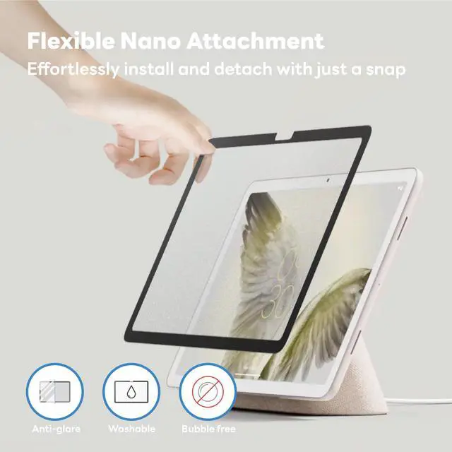 REMOVABLE AND REUSABLE - Using "Nano Attachment Tech", the screen protector adheres to the tablet screen securely without any metal or magnet. It can be easily removed and reused.
