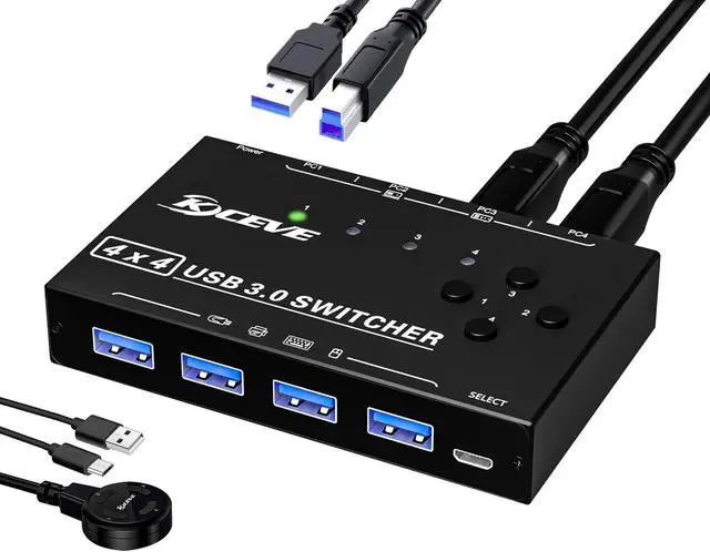 USB 3.0 Switch, USB Switcher 4 Computers for Printer Scanner Keyboard Mouse Switch, USB-B Switch, USB Switch Selector with Wired Control and 4 USB Cables...