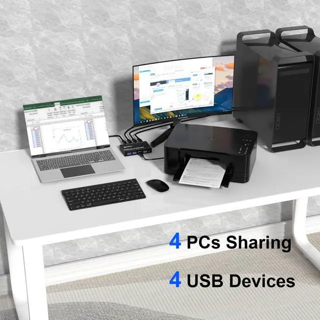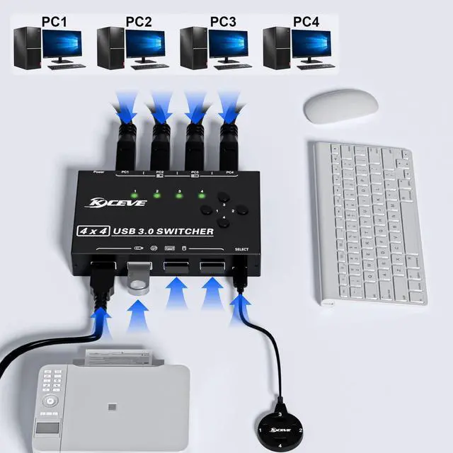 [(USB3.0 Switch)] This USB switch allows users to control 4 computers to share 4 USB3.0 peripheral devices together, such as keyboard, mouse, printer, scanner, USB flash drive, etc. No more need to prepare multiple USB devices or change locations repeatedly, making life simpler and tidier!