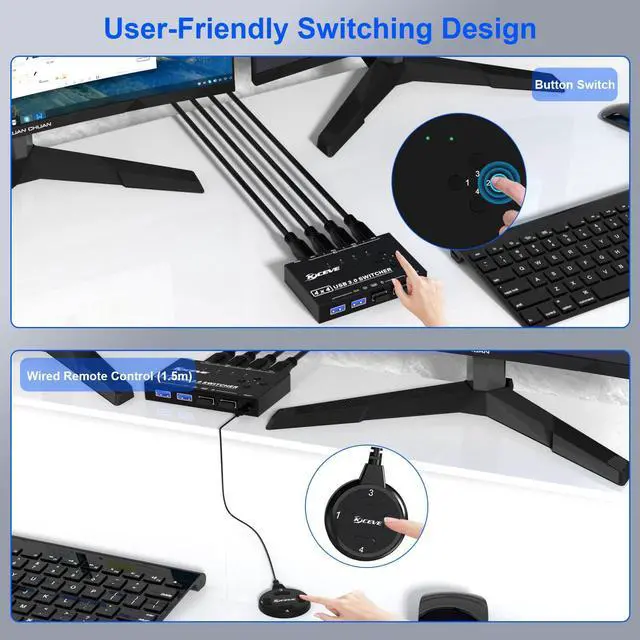 [(User-Friendly Switching Design)] Push-button switching and wired remote control switching available. Use the 1.5m remote control, you can hide the switch anywhere and keep the remote control handy. No more dealing with cluttered desktops, making desktop tidier and switching easier!