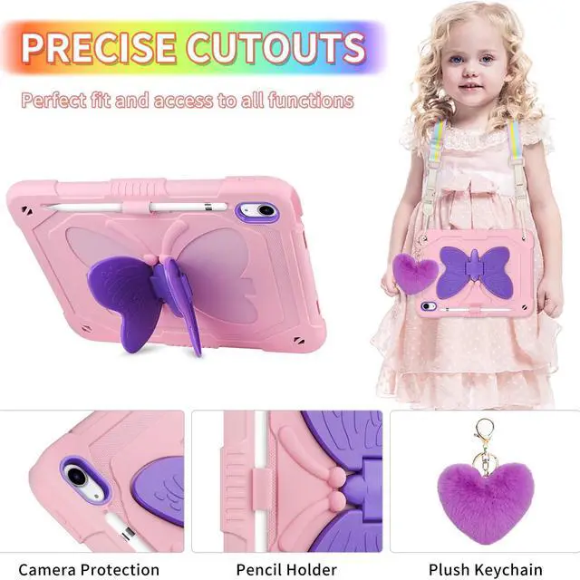 WESADN for iPad 10th Generation Case 2022 with Screen Protector/Butterfly Kickstand/Lanyard/Keychain Rugged Case with Pencil Holder for Girls Kids Cover for iPad 10th Gen 10.9'' Pink Purple