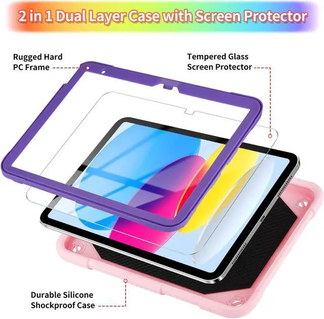 Screen Protector: For iPad 10th generation case with hard PC frame and silicone back cover,dual layer drop proof design is rugged,provides a strong protection to the tablet.With a screen protector made of tempered glass,protects the screen from bumps