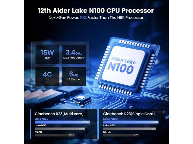 FAST N100 PROCESSOR - Compared to 12th Gen N95 mini PC, the performance is boosted by 10% and is 35% faster than the N5105. We built our mini PC to feature 24EU UHD Graphics, 4C/4T, 6MB cache, 2.0-3.4GHz, and a TDP of up to 15W. Ideal for light multitasking, office, and light gaming.