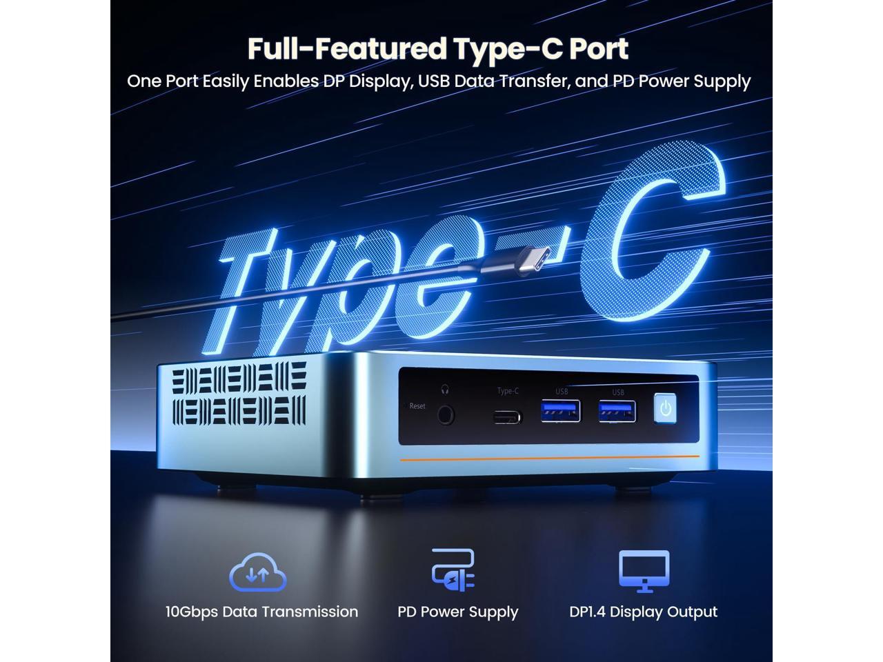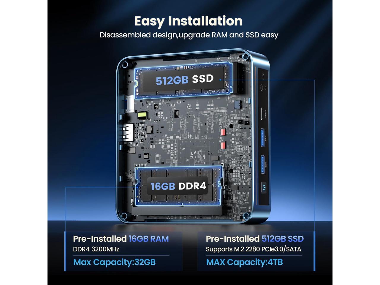 16GB DDR4 and 512GB SSD - Built with 1 so-dimm 3200MHz DDR4 RAM slot and M.2 2280 SSD PCIe 3.0/SATA slot, this mini computer supports expansion up to 32GB of RAM and 4TB of storage. It comes pre-installed with 16GB DDR4 and a 512GB SATA SSD, enabling faster boot times and easy storage management.