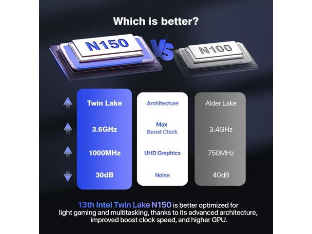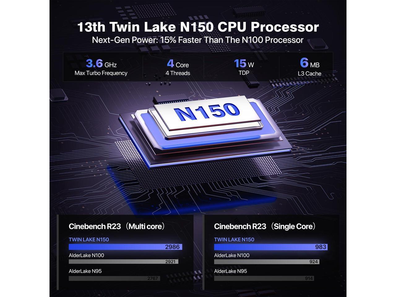 - 13TH GEN N150 PROCESSOR - Compared to 12th gen N100 and N97, the performance is boosted by 20% and is 30% faster than the N95. We built our mini PC to feature 1000MHz UHD Graphics, 4 cores, 4 threads, 6MB cache, 2.0-3.6GHz, and a TDP of up to 15W. Ideal for multitasking, office, and light gaming.