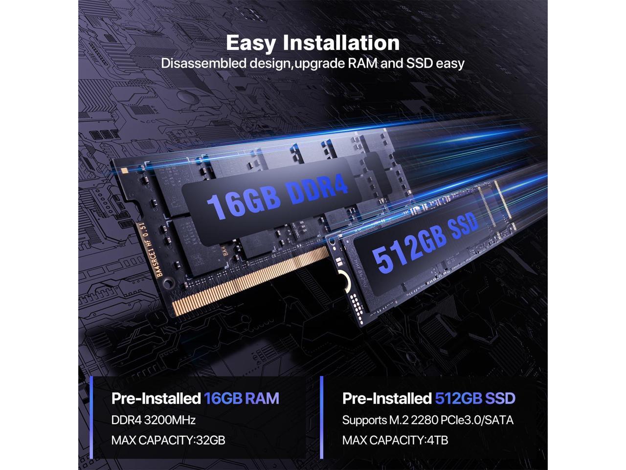 - UPGRADE YOUR STORAGE EASILY -Built with 1 so-dimm 3200MHz DDR4 RAM slot and M.2 2280 SSD PCIe 3.0/SATA slot, this mini computer supports expansion up to 32GB RAM and 4TB SSD. It comes pre-installed with 16GB DDR4 RAM and a 512GB SATA SSD, enabling faster boot times and easy storage management.