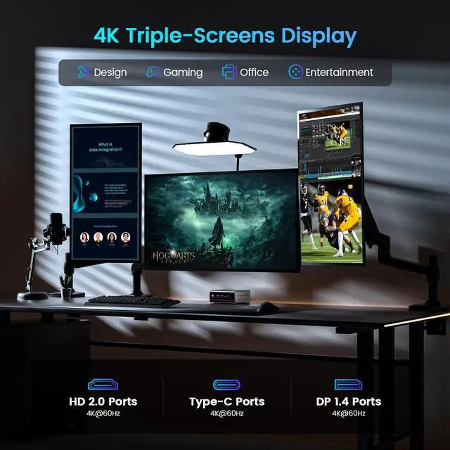 (Storage devices sold separately) ^^ Professional Dual Ethernet Ports and Wireless ConnectivityEquipped with a high-speed 2.5 Gigabit Ethernet port for NAS/file transfers (up to 2.5G bps) and a standard Gigabit port for stable network connections. Combined with WiFi 6 and Bluetooth 5.2 technology, it delivers flexible, stable, and low-latency connectivity for gaming, streaming, and home office use. ^^ Triple-display & 4K/60Hz UHD Video OutputThis small pc has Radeon Graphics that frequency is supports 4K 60Hz triple screen display. It can support up to three 4K displays via HD port, Type-C, without any limitation on the combination used.