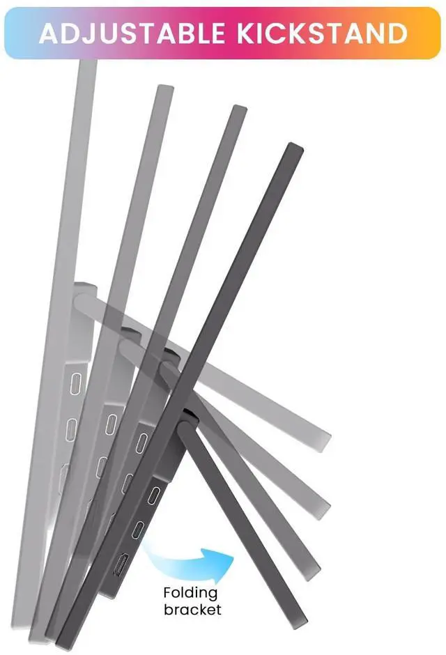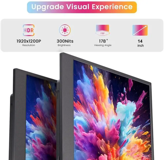 14-inch Portable Monitoran ideal companion for professionals, students, and entertainment lovers on the go. Featuring a high-definition IPS display, this monitor delivers vibrant colors and wide viewing angles, ensuring crisp and clear visuals for work, study, or leisure. Whether you're editing documents, watching movies, or gaming, the immersive screen enhances every experience ^^ Weighing just 1.3 pounds, it's incredibly lightweight and easy to carry in your bag, making it perfect for business trips, remote work, or use in tight spaces at home. The slim design and built-in kickstand allow for quick and stable desktop setup, while VESA compatibility offers flexible mounting options on walls or monitor arms for a customized workspace ^^ Connectivity is simple and versatile with both USB-C and HDMI ports, enabling seamless connection to laptops, tablets, smartphones, and gaming consolesno additional drivers required.