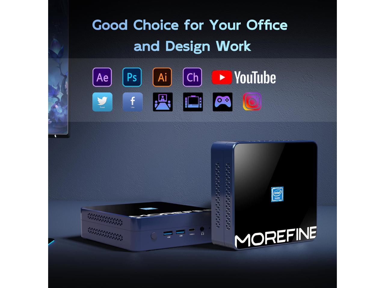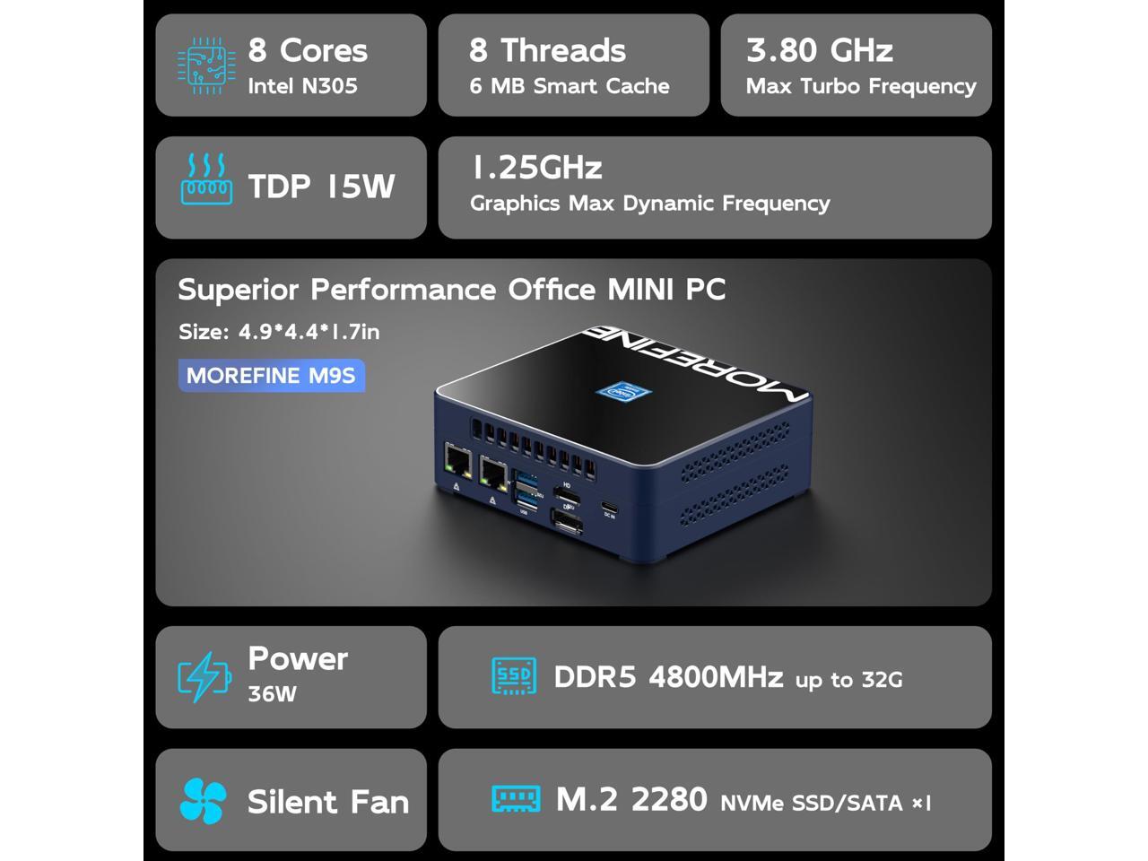 - [(12th Alder Lake N305 Mini PC )] MOREFINE M9S mini desktop computer with 12th Alder Lake N305 (up to 3.8GHz) processor. The performance improved 30% compare to the N100, N95 and N5105. Perfect for handle streaming, photo editing, office work tasks or use as a NAS and soft router