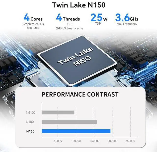 2025 New TWIN LAKE N150 ProcessorM9 mini pc equipped with latest Intel Twin Lake-N150 processor (Upgraded N100), with 4C/4T and 6MB L3 cache, up to 3.6GHz. The overall performance of the N150 CPU is 10% better than the N100 CPU. This mini desktop computer is faster and performs better.