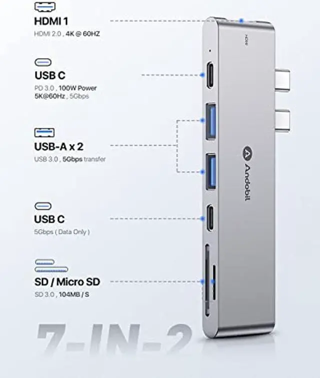 [ Perfect Business Adapter Style & Handheld Size ]: Andobil is the Best MacBook Pro/Air USB c hub. Expand your MacBook's 2 USB-C ports into 1 Thunderbolt 3 (100W Power Delivery), 1 USB-C data port, 2 USB-A ports, 1 HDMI port, 1 SD card slot, and 1 microSD card slot.