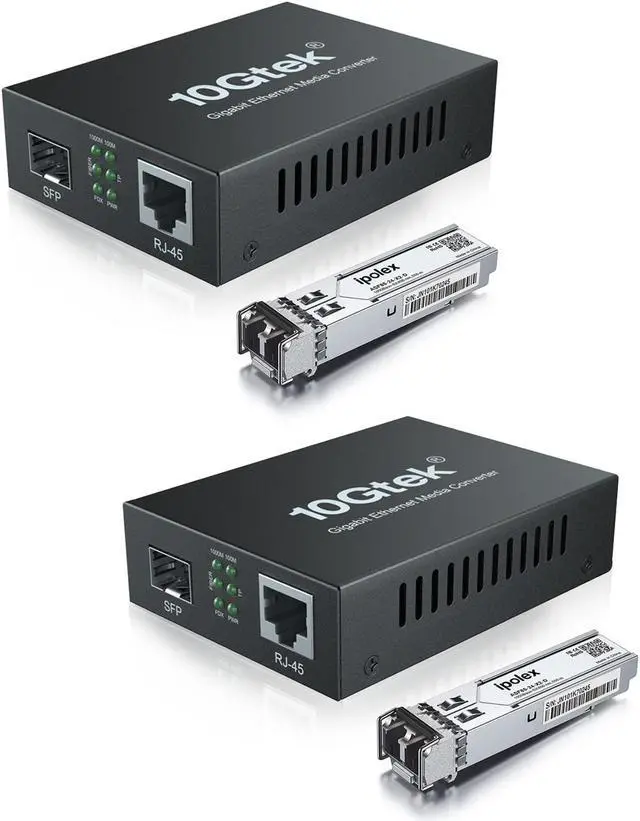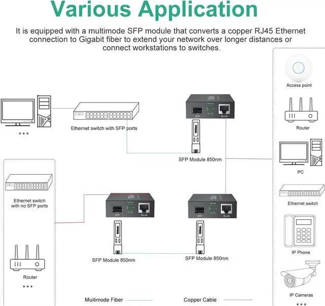 Seamless Conversion of LC Fiber to Copper - This fiber optic to ethernet media converter kit includes 2 pack of multimode 1000BASE-SX SFP modules(850nm), which enables you to convert 1000BASE-SX LC fiber to 10/100/1000 Base-T RJ-45 copper media or vice versa.