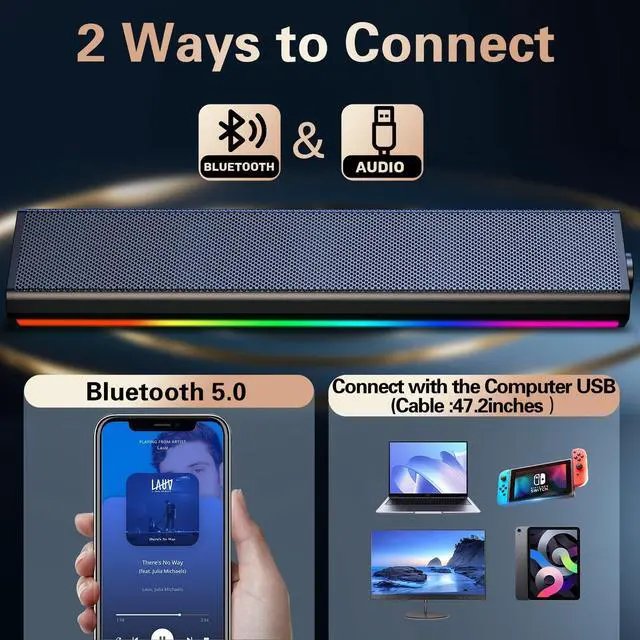 Audio: USB computer speakers for direct power and sound (Type-C adapter included) or Bluetooth computer speakers for wireless streaming. Perfect as PC speakers for desktop, laptop, or monitor setupsrequires USB power for all modes.