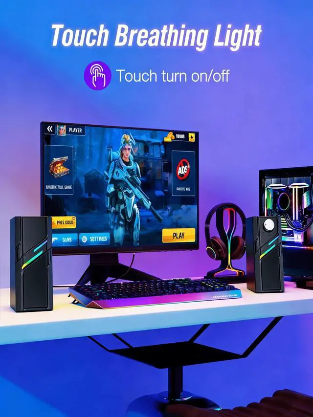 LENRUE Computer Speakers for Desktop PC with Easy Knob, Clear Powerful Sound, Touch Lights, Plug and Play for Computer Desktop PC, Monitors, Laptop (USB & AUX)