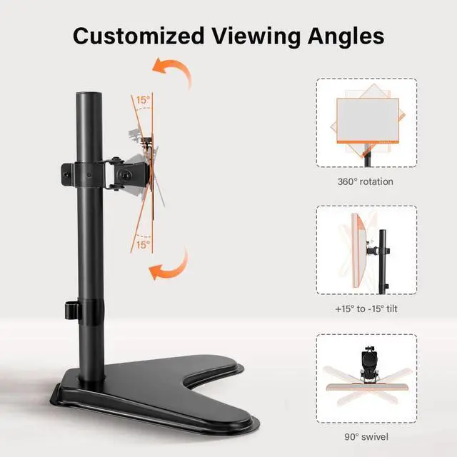 Height Adjusable and Swivel Monitor Arm:the Full Motion Monitor Desk Mount offers +15deg to -15deg tilt, 90deg swivel, 360deg rotation, and height adjustment along the center pole.