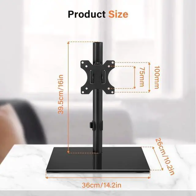 Screens: The KKTONER freestanding single monitor Mount fitting screens from 13 to 32 in size and weight up to 17.6 lbs with 75x75mm or 100x100mm backside mounting holes. ^^ Height Adjusable and