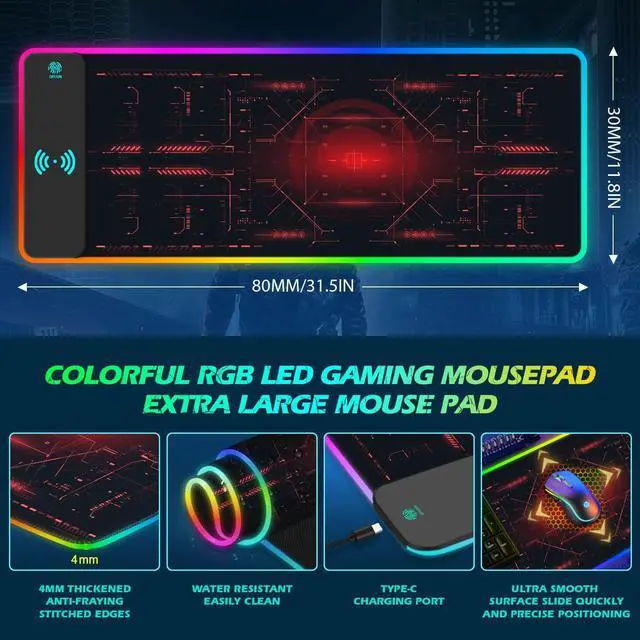 ToLuLu RGB Gaming Wireless Charging Mouse Pad, 5/7.5/10/15W 10 Light Modes LED Mouse Pad Computer Keyboard Mat Mousepad, 800x300x4MM Extended Large Desk Mat for Gaming, MacBook, Laptop, PC,Cool Red