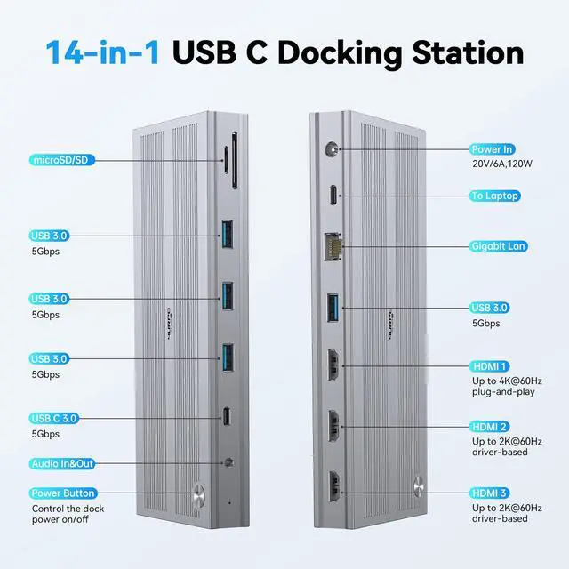 Powerful Scalability: This USB C docking station has 14 ports, making it ideal for professionals who need to expand to three monitors, and provides 120W charging to support your work and improve efficiency