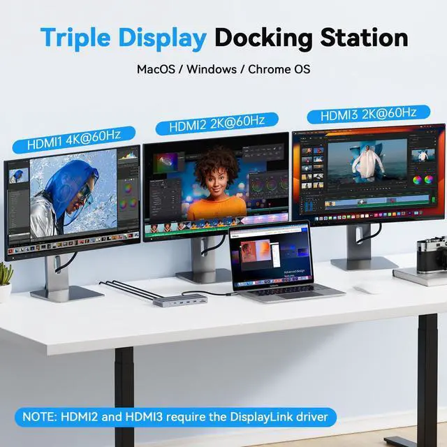 3 HDMI Display: Supports 3 HDMI outputs even on M1, M2, M3 and M4, allowing you to expand your laptop to triple monitors effortlessly. Enjoy superior video quality with HDMI 1, supporting up to 4K@60Hz, and HDMI 2 & 3, which support 2K@60Hz. USB C docking station triple monitor solution that elevates your productivity and viewing experience