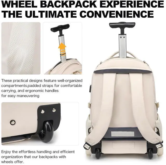 Boavan Rolling Backpack for Women, 17.3 Inch Wheeled Laptop Backpack,Large Travel Carry-On Bag for Teachers College Students, USB Charging Port Waterproof Business for Airplane Overnight Luggage,Beige