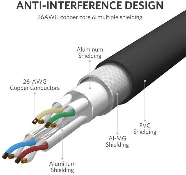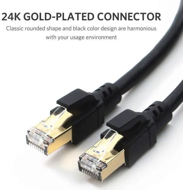 ANTI-INTERFERENCE DESIGN: The professional network cable made of 4 shielded foiled twisted pair(S/FTP) oxygen-free copper wires(26AWG) with 24K gold-plated RJ45 connectors on each end. Compared to the Cat 7 network Ethernet cable, the additional shielding and improved quality in twisting of the wires provides better protection from crosstalk, noise, and interference that can degrade the signal quality. This will increase the reliability and accuracy of the data transfer.
