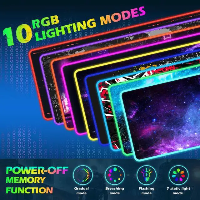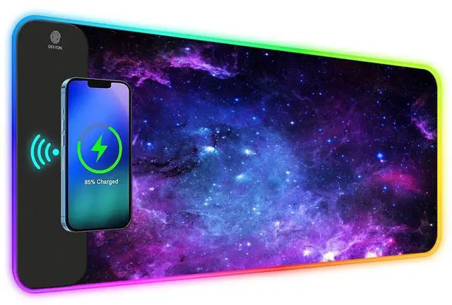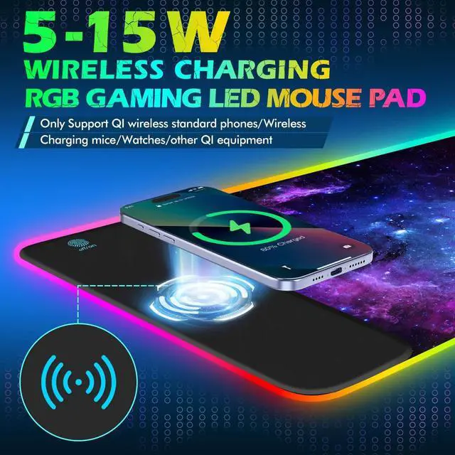 15W RGB Gaming Qi Wireless Charging Mouse PadRGB Gaming mouse pad built-in 5/ 7.5 /10/15W wireless fast charging compatible with smartphones which support wireless charging such as iPhone 8/X/XR/XS/11/11 Pro, Galaxy 10/S9/S8 Plus, Galaxy Note 9/8, and all other devices that support Qi. (Please note that the charging adapter is not included in this package. You can find a bundle with a charging adapter in our store. ) ^^ 10 RGB LED Lighting Modes Light Up Your DeskRGB mouse pad with wireless charging made of super luminous, which customizes 10 lighting modes, including colorful, dynamic breathing lighting mode, 7 static monochrome lighting mode and lights off mode.
