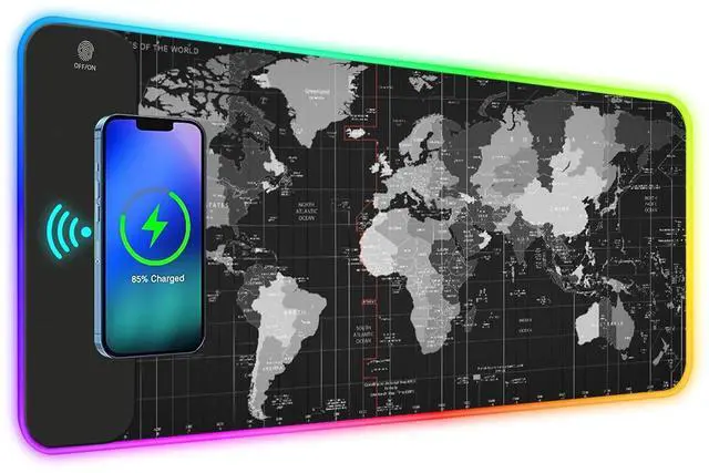 providing a unique atmosphere when playing games or working. The memory function helps to remember the light mode selected when it was last turned on ^^ Enjoy the joys of technologyJust place your phone, wireless charging earphones or watch in the designated wireless charging area and it will automatically start charging. The mouse mat is powered by Type-C, and a charging cable is included in the package Just plug in the Type-C cable to your power adapter or computer and you're ready to go. ^^ XXL Large 4MM Thickness Enhances Gaming ExperienceUpgrade your office desk or gaming station with our extra-large desk pad, measuring 800x300x4MM,.