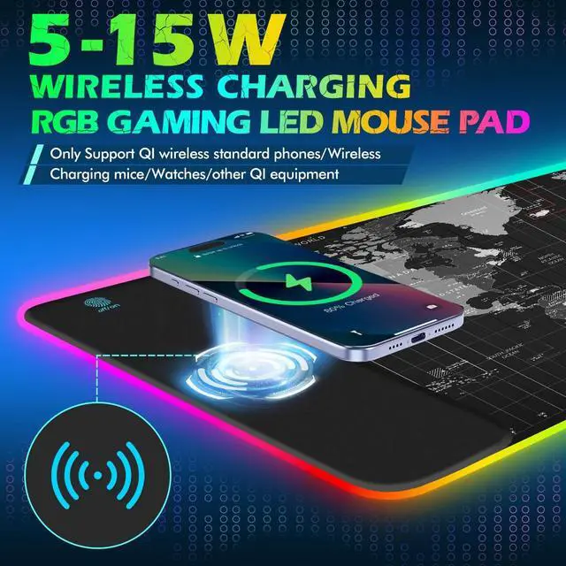 15W RGB Gaming Qi Wireless Charging Mouse PadRGB Gaming mouse pad built-in 5/ 7.5 /10/15W wireless fast charging compatible with smartphones which support wireless charging such as iPhone 8/X/XR/XS/11/11 Pro, Galaxy 10/S9/S8 Plus, Galaxy Note 9/8, and all other devices that support Qi. (Please note that the charging adapter is not included in this package. You can find a bundle with a charging adapter in our store. ) ^^ 10 RGB LED Lighting Modes Light Up Your DeskRGB mouse pad with wireless charging made of super luminous, which customizes 10 lighting modes, including colorful, dynamic breathing lighting mode, 7 static monochrome lighting mode and lights off mode.