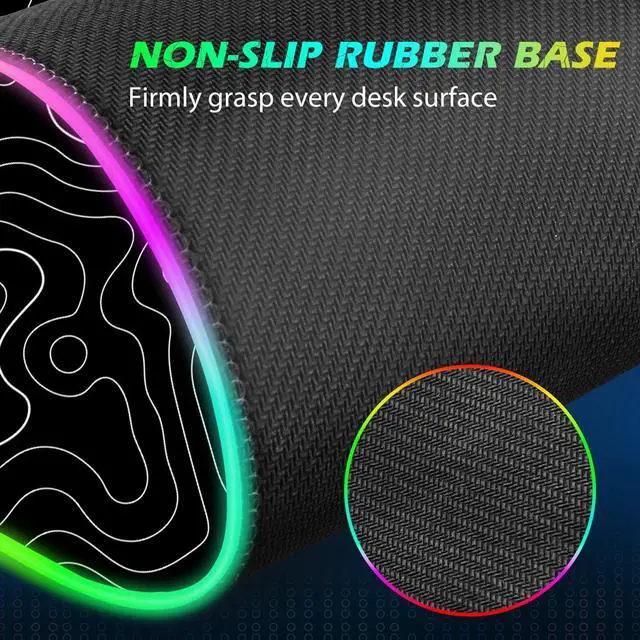 • 10 RGB LED Lighting Modes Light Up Your DeskRGB mouse pad with wireless charging made of super luminous, which customizes 10 lighting modes, including colorful, dynamic breathing lighting mode, 7 static monochrome lighting mode and lights off mode. providing a unique atmosphere when playing games or working. The memory function helps to remember the light mode selected when it was last turned on