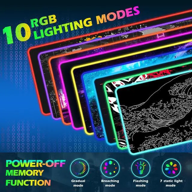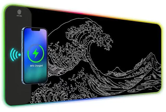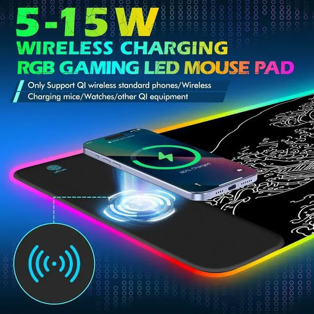 15W RGB Gaming Qi Wireless Charging Mouse PadRGB Gaming mouse pad built-in 5/ 7.5 /10/15W wireless fast charging compatible with smartphones which support wireless charging such as iPhone 8/X/XR/XS/11/11 Pro, Galaxy 10/S9/S8 Plus, Galaxy Note 9/8, and all other devices that support Qi. (Please note that the charging adapter is not included in this package. You can find a bundle with a charging adapter in our store. ) ^^ 10 RGB LED Lighting Modes Light Up Your DeskRGB mouse pad with wireless charging made of super luminous, which customizes 10 lighting modes, including colorful, dynamic breathing lighting mode, 7 static monochrome lighting mode and lights off mode.