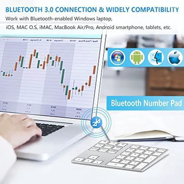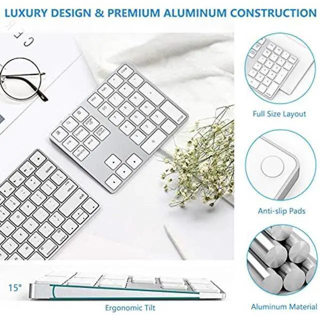 Aluminum Bluetooth Keypad: This Aluminum Bluetooth number pad features solid aluminum coating and ergonomic tilt design, compact Apple-style pad perfectly match your apple magic keyboard and bluetooth devices.