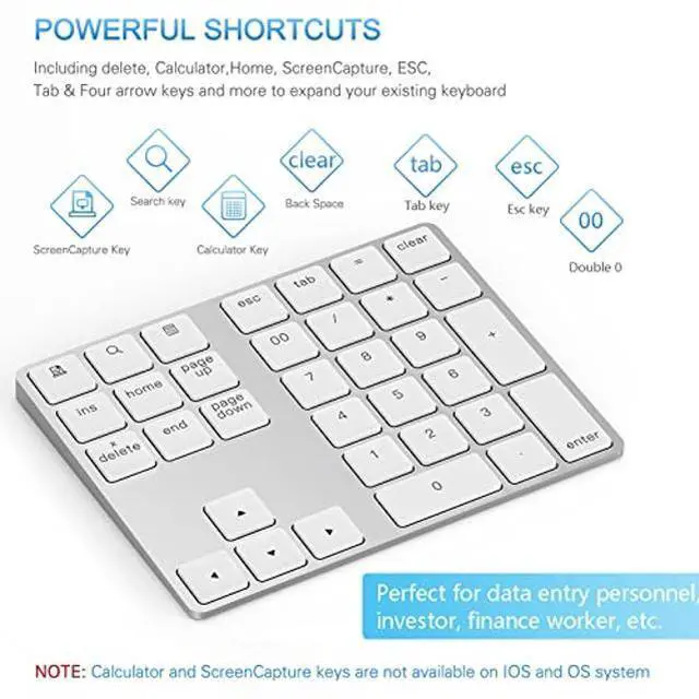 Lekvey 34-Keys is a keypad you can really rely on to work with your Bluetooth-enabled PC - no receiver required. Whether you use a laptop, desktop, Mac or Windows tablet, this is the only Bluetooth wireless keypad you need.