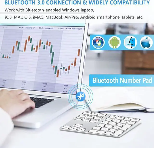 Bluetooth 5.0 Connection: Bluetooth 5.0 technology provides a cable-free & clutter-free connection, the external Bluetooth number pad 34-keys full keypad extends your existing keyboard, operating distance 10 m. Note: For Laptop Desktop PC without Bluetooth function, you need to use third-party Bluetooth adapter (not included) before use