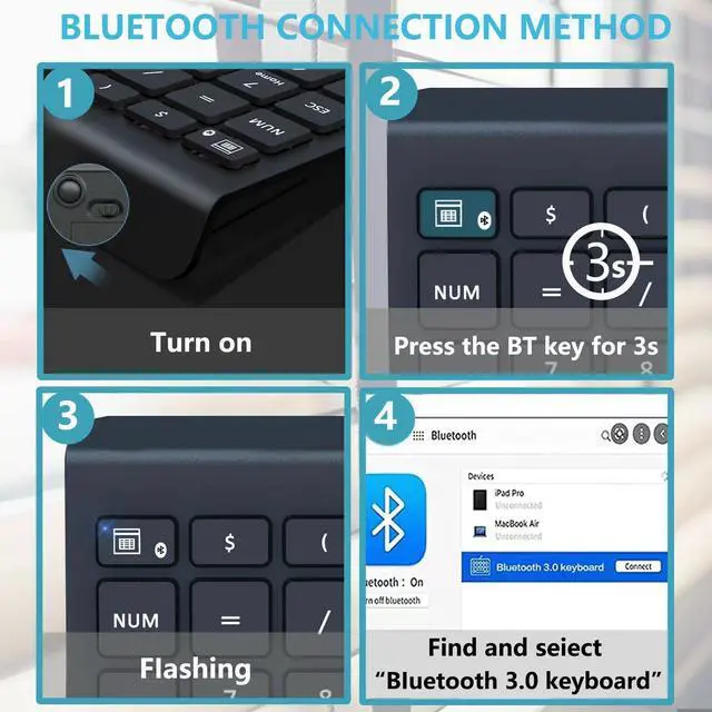 Multi-Function 28-Keys Bluetooth Number Pad: This premium Bluetooth number pad full-sized 28-key with Numlock, Delete, Tab & More Use. The classic wireless numeric keypad with calculator shot-key and numlock functional keys (PgUp, PgDn, Home, End, up, down, left, right arrow keys), (), DEL, = + - / * , Backspace, ESC, Tab, ' . 00, 0123456789, enter keys which assist you in accounting tasks, excel spreadsheets. Greatly improve your work efficiency